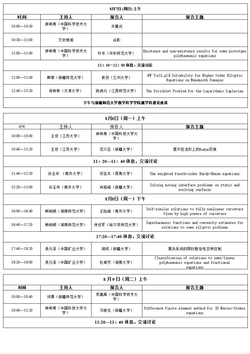 举办“分析、几何与相关应用--中科大、新疆师大联合会议”。 会议期间,与会专家学者将共同探讨本领域的前沿热点及发展方向,并就共同关心的其它相关问题进行交流研讨。
